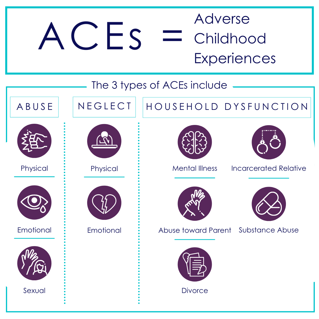 Nine types of ACEs: physical abuse, sexual abuse, emotional abuse, mental illness of a household member, problematic drinking or alcoholism of a household member, illegal street, or prescription drug use by a household.